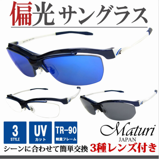 | サングラス 偏光レンズ Maturi マトゥーリ スポーツ サングラス 偏光 リーボミラー 3種類レンズ付 TR-90 度付き対応 TK-92-6 NV/WH |