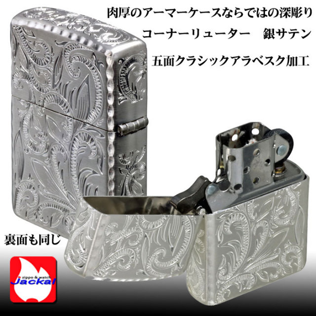 通常の約1.5倍の厚みをもつ重厚なアーマーケースのジッポーがベース。 表・裏・トップ・両サイドの5面にわたる部分に、とても美しいアラベスク(唐草)模様を深彫り彫刻。 アーマーならではの特性を活かし加工を施した、エレガントで高級感のある仕上がりになりました。 表面のコーナーにはリューター加工が施されており、さらに高級感が醸し出されています。 シルバーサテーナ仕上げで上品な仕上がりに... 専用化粧箱入りで、プレゼントやギフトにも最適です。 ■仕様:シルバーサテーナ仕上げ、五面深彫り彫刻、コーナーリューター加工 ■ZIPPOケース:アーマーケース ■付属品:ZIPPO専用化粧箱、ZIPPO社永久保証書 |